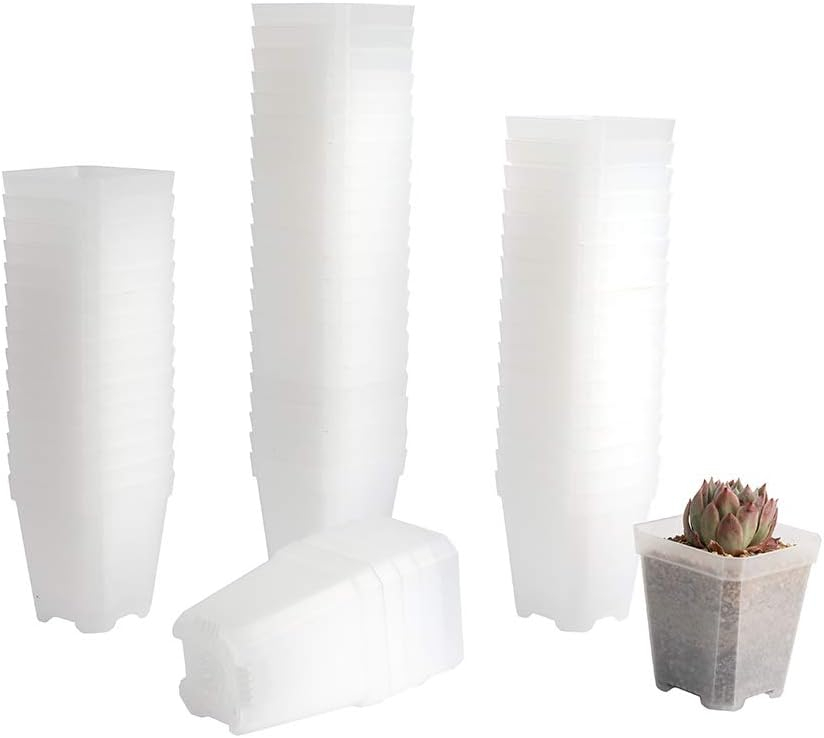 Package includes 60pcs clear small square plastic plant pots, both available for indoor and outdoor application. Pot size in 2.70”W x 3.10”H, ** no saucers and plants included **